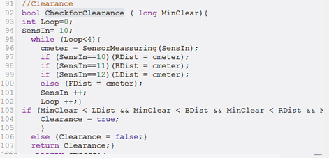 The second function was named as CheckforClearance and uses the reading of all 4 ultrasonic sensors for determine if there is enough space around the car while moving or before executing an order. This variable receives a value that represents the minimun distance necessary for executing an order and returns a True or False boolean variable that is used by the program to continue to the next order.
