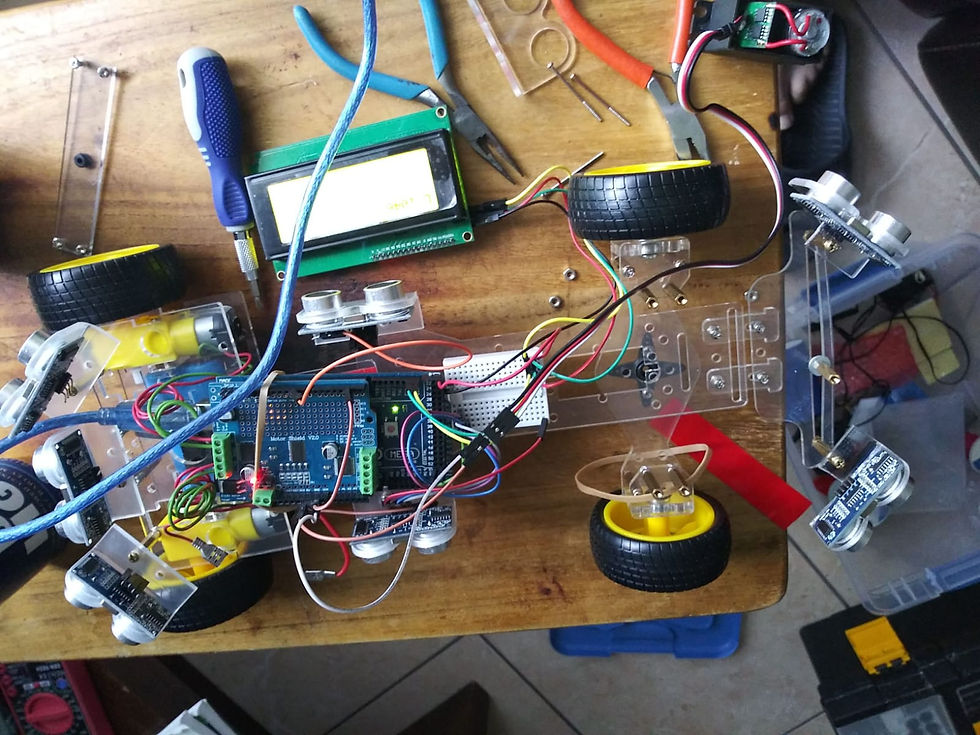 The progress we made was by purchasing small extenders which allowed for us to mount the ultrasonic sensors more efficiently. What I mean by that is that the sensors are more solidly attached and it allowed us to make build the car a little more vertical so we could rearrange the setup to allow better mobility. We also extender the fender a little more which allows for an almost 40 degree turn radius.